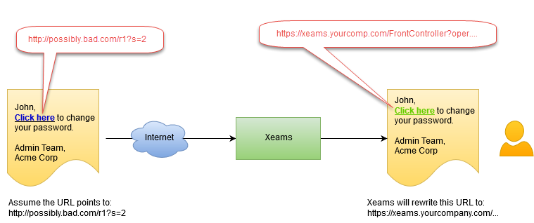 Starting v7.0, Xeams can optionally rewrite every URL inside an incoming email from the Internet, allowing a