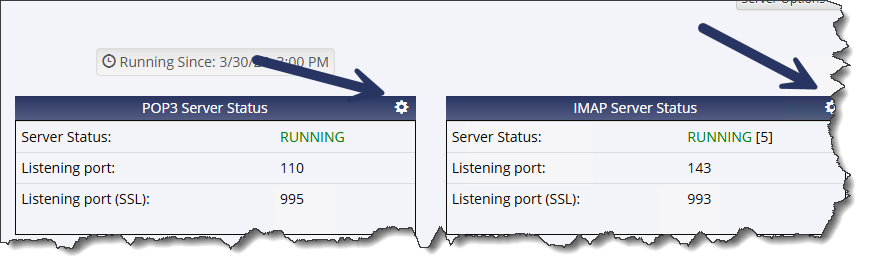 - Click the gear icon for either POP3 or IMAP status box, as shown below.