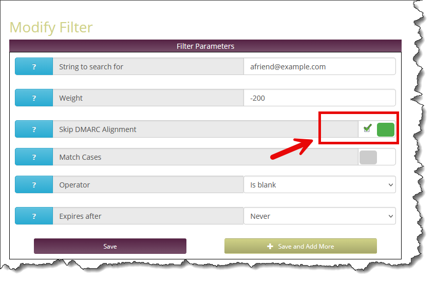 Most senders these days are DMARC-aligned - meaning they either have an aligned SPF or DKIM. A non-aligned DMARC usually means a configuration problem on the sender's end. In the rare cases where DMARC is not aligned, but you will want to accept emails from that sender, you can check the Skip DMARC alignment box when creating a sender filter, as shown below.